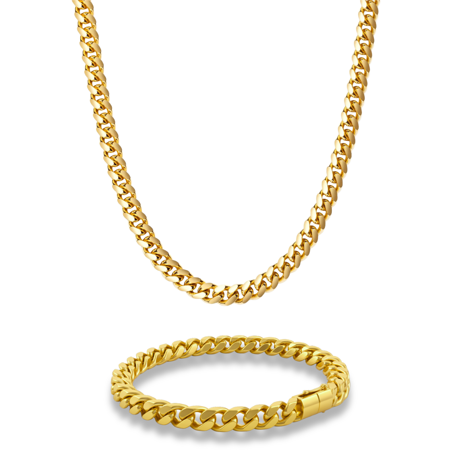 Gold chain and bracelet curated to complement each other. Comfortable widths for a dynamic silhouette that elevates any fit.