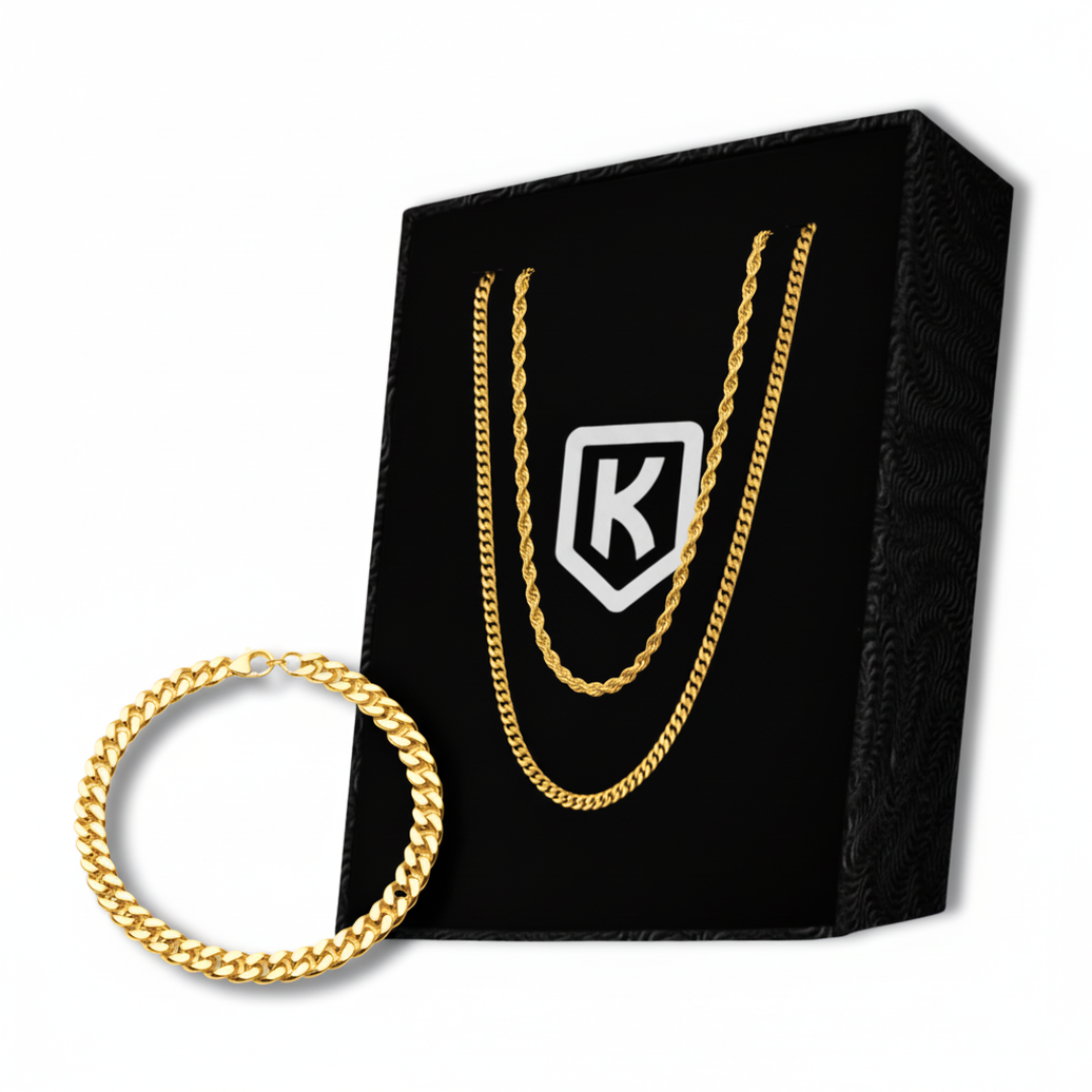 Three-piece gold stack built to turn heads without trying. Layer complementary widths for depth, then finish with the bracelet for a clean, unified look.