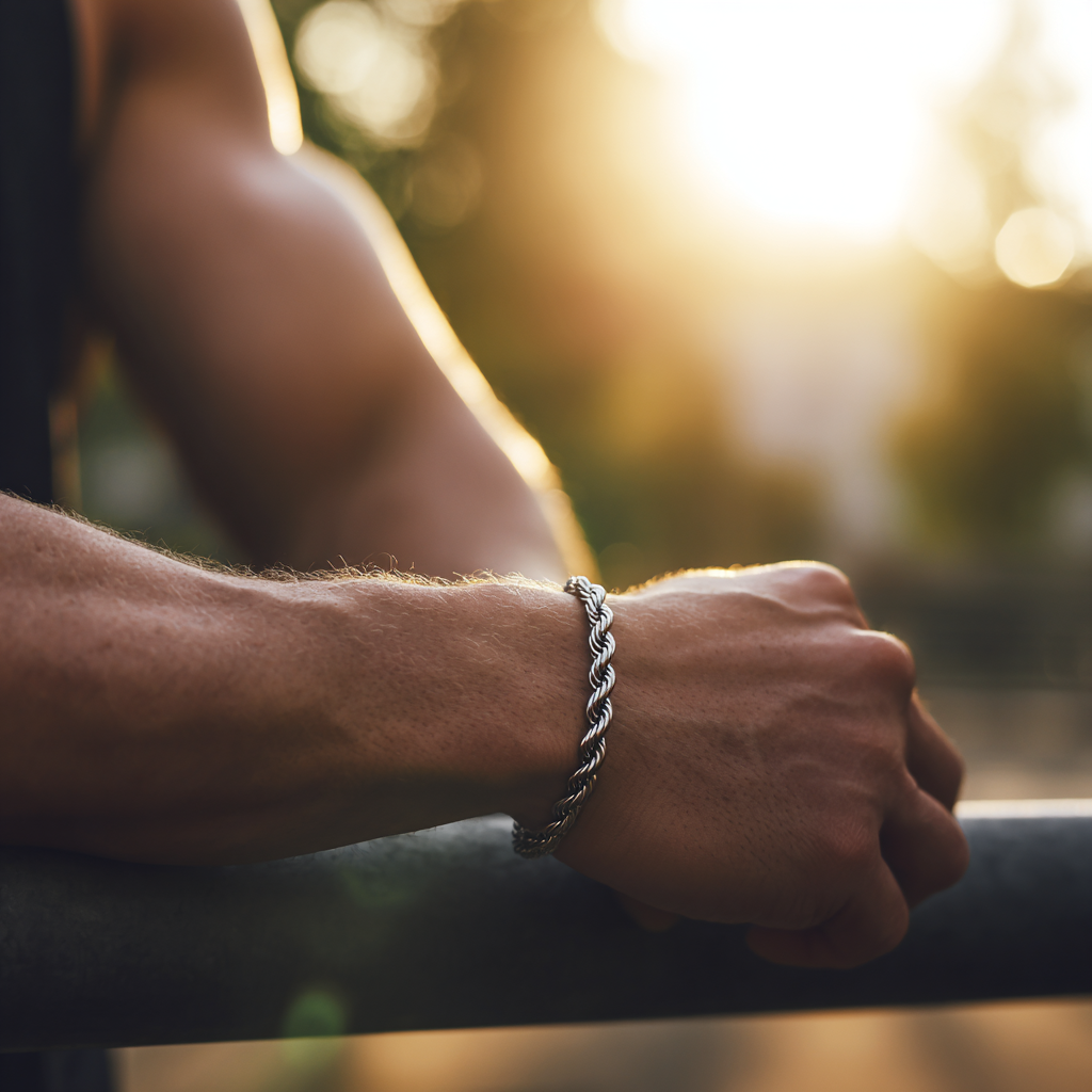 A 3mm silver rope bracelet that plays well with watches. Subtle texture, clean finish, all-day comfort.